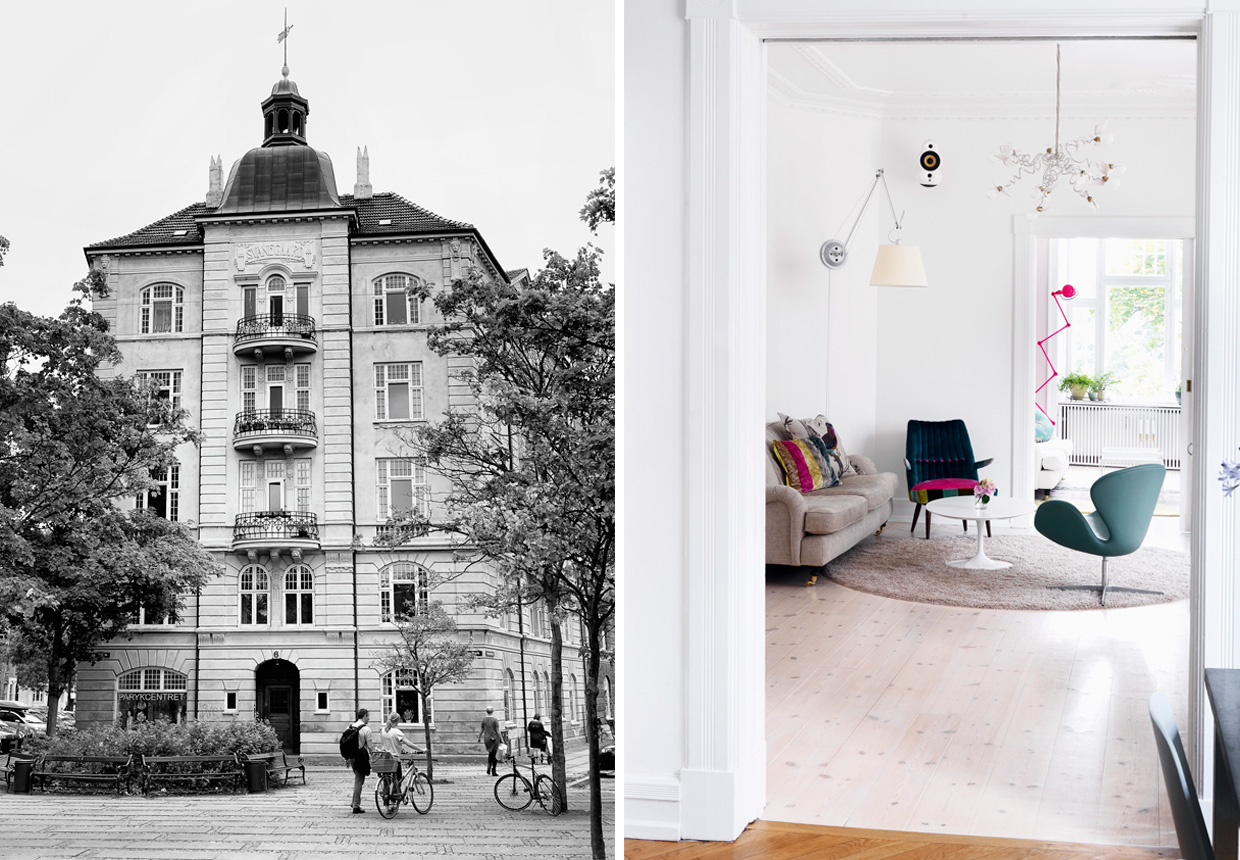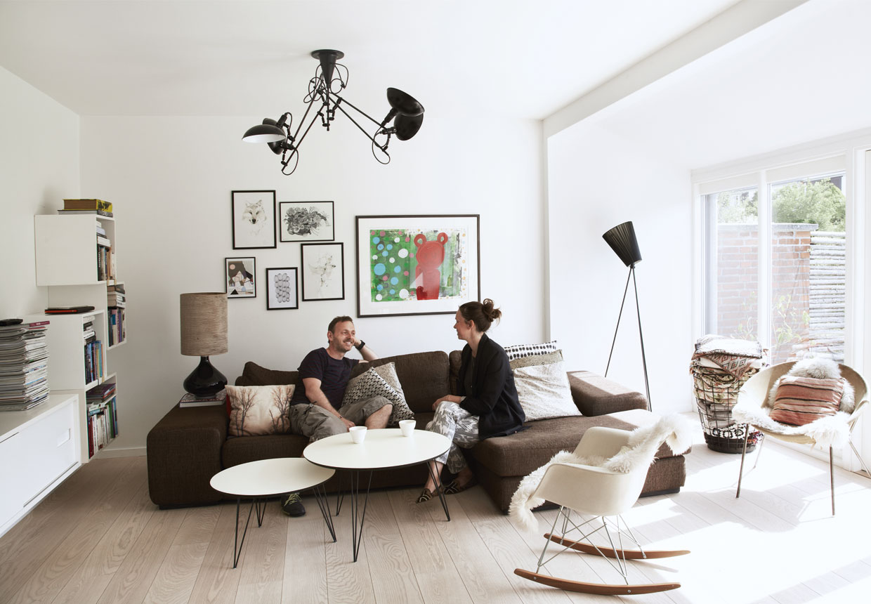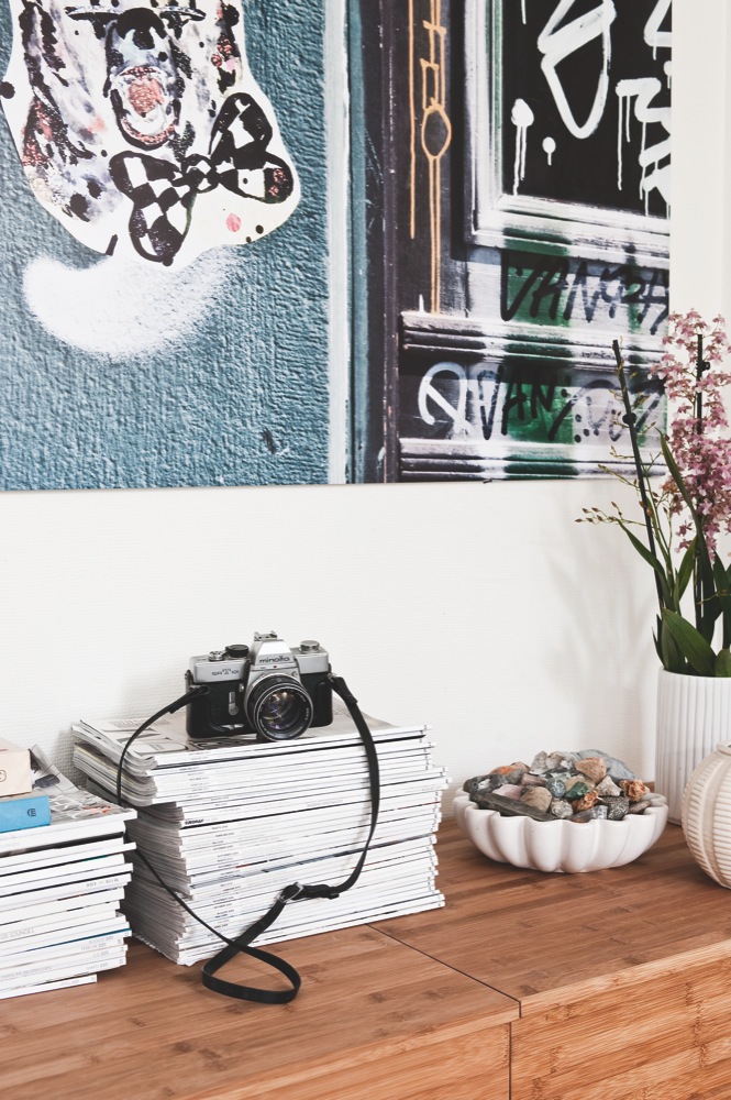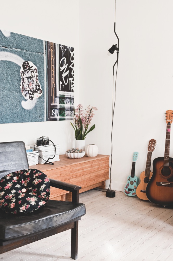 Den fine, poetiske samling af billeder over sofaen har Camillas svigermor fundet i en container, og motiverne har fået nyt liv med sorte rammer. Sofabordet er en prototype fra We Do Wood. Den stribede pude er skabt af tekstildesigner Anne Nowak, de andre er hjemmesyede. Fridas barnevogn er en Emmaljunga-model, som Camilla har fundet i en genbrugsbutik. De gamle arkivkasser ved siden af sofaen stammer fra en oprydning på Gentofte Rådhus.