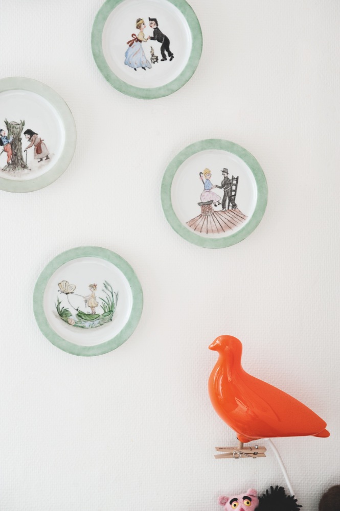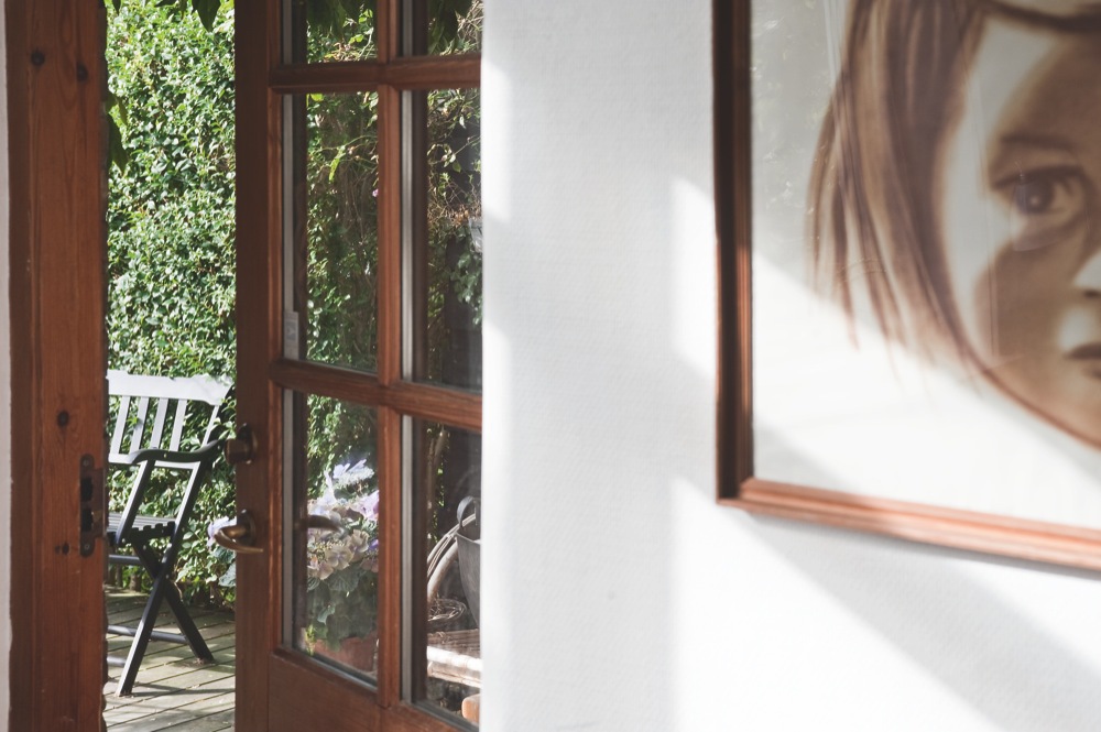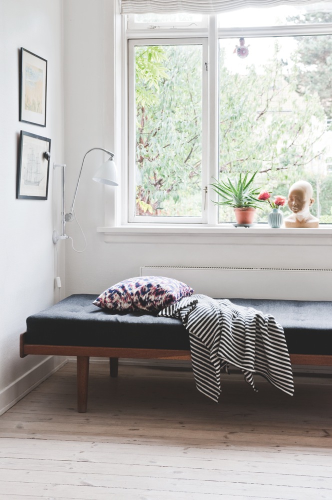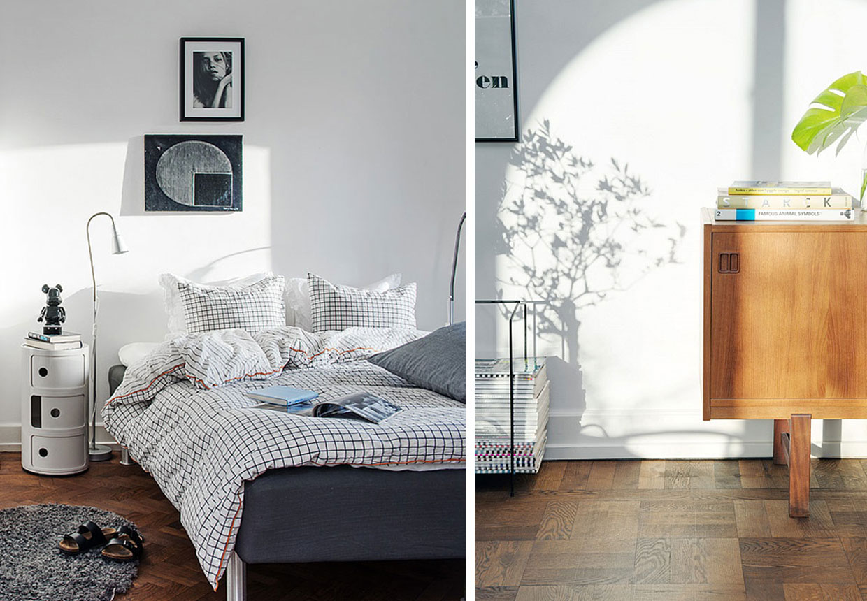 Den fine, poetiske samling af billeder over sofaen har Camillas svigermor fundet i en container, og motiverne har fået nyt liv med sorte rammer. Sofabordet er en prototype fra We Do Wood. Den stribede pude er skabt af tekstildesigner Anne Nowak, de andre er hjemmesyede. Fridas barnevogn er en Emmaljunga-model, som Camilla har fundet i en genbrugsbutik. De gamle arkivkasser ved siden af sofaen stammer fra en oprydning på Gentofte Rådhus.